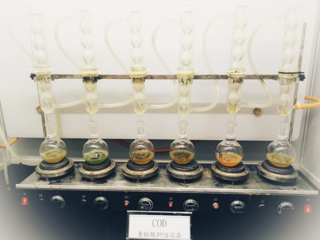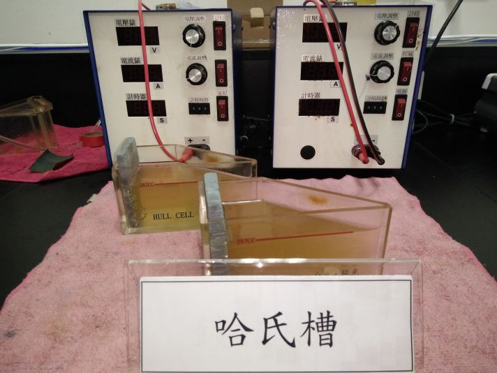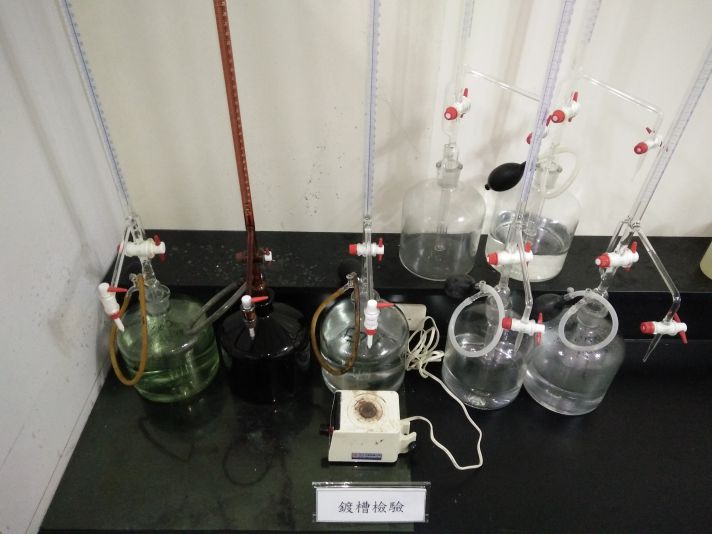 藥水檢驗 光譜分析儀 用於分析產線雜質含量。 光譜分析儀 分光儀 用於分析鈍化劑含量。 分光儀 水份分析儀 用於分析液體水份含量。 水份分析儀 哈氏槽 用於分析產線鍍浴。 哈氏槽 鍍液檢驗 用於分析產線鍍浴參數。 鍍液檢驗 重鉻酸鉀迴流法檢驗 用於分析放流水COD含量。 重鉻酸鉀迴流法檢驗